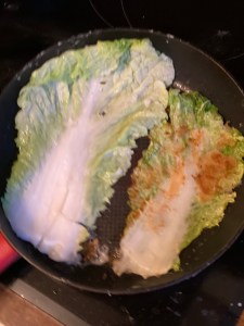 4.加入一點橄欖油熱鍋,然後下白菜,一片一片用中火去煎。