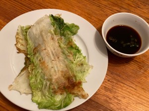 5.煎到白菜熟了、麵糊部分呈現一點煎餅的金黃感時,就可以起鍋沾醬食用。