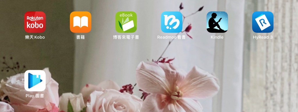 然後第四頁是電子書頁面。有些人會有特別習慣使用或推薦的電子書軟體,不過我基本上就是全部常用的都有下載,博客來、Kobo、Readmoo、HyRead、Kindle、GooglePlay之類的,蘋果內建的也有保留。以現代台人而言我應該是閱讀量算大的人,這樣的使用方式目前來說沒有太大困擾,原則上就是看哪個通路買來的最便宜划算又方便就用那個看。當然每個功能和長處、或是適用的語言有點不同,這個部分和筆記、學習軟體一樣,可能都要另外再慢慢得出更完整的心得來分享。目前這樣的分頁方式,我覺得效果滿好的,順帶的自我感覺也會滿良好哈。